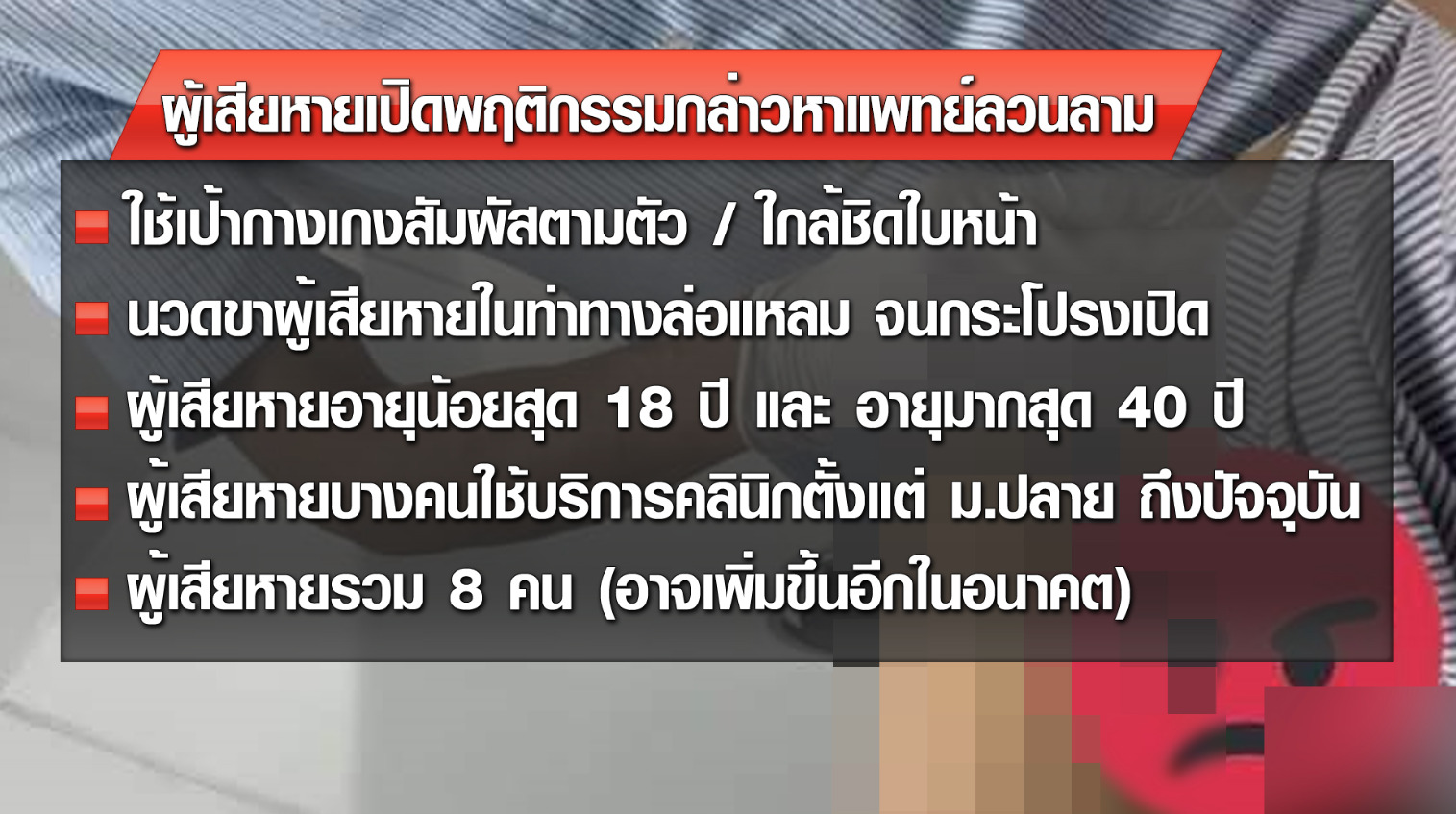 ผู้เสียหาย บอกว่า หลังจากรักษาเสร็จได้แจ้งพ่อแม่ทันที แต่ยอมรับว่าขณะนั้นไม่กล้าโวยวาย เพราะหลักฐานมีเพียงคลิปซึ่งถ่ายเก็บไว้ตอนฉีดยาช่วงแรก เนื่องจากตั้งใจจะส่งให้เพื่อนดูว่ามาฉีดยา แต่หลังจากได้โพสต์เรื่องราวลงโซเชียลมีเดีย มีผู้เสียหายอีก 8 คนติดต่อมาว่าเคยเจอเหตุการณ์ลักษณะเดียวกัน บางคนเคยถูกลวนลามขณะนวดกายภาพ บางคนเคยถูกลวนลามขณะเรียนมัธยมปลาย ส่วนรายที่หนักสุดให้ข้อมูลว่า ถูกเป้ากางเกงสัมผัสตามตัวและขึ้นมาใกล้ใบหน้า
