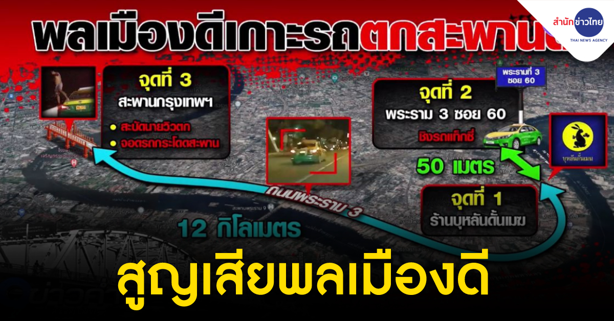 กรุงเทพฯ 19 พ.ค. – เมื่อคืนนี้ เกิดเหตุการณ์ชายคนหนึ่งมีอาการมึนเมา ทำร้ายพนักงานรับรถร้านอาหาร ย่านพระราม 3 แล้วชิงรถแท็กซี่ที่จอดติดเครื่องไว้หนี แต่พนักงานร้านอาหารที่ถูกทำร้าย กระโดดเกาะรถแท็กซี่คันนั้น และพลัดตกสะพานพระราม 3 เสียชีวิต. – สำนักข่าวไทย
