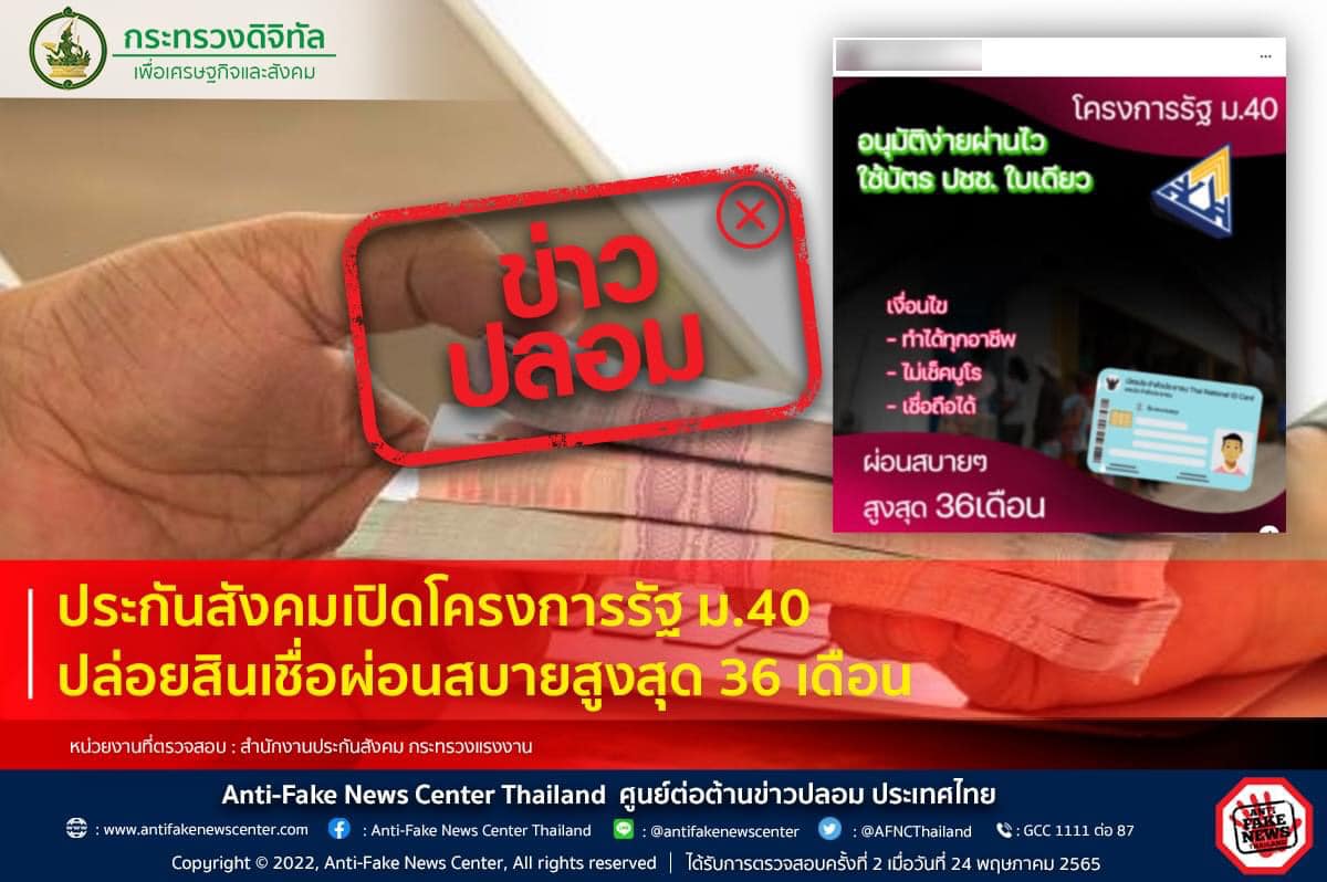 กรณีเพจเฟซบุ๊กได้กล่าวถึงสินเชื่อโครงการรัฐ ม.40 ที่ระบุว่าอนุมัติง่ายผ่านไว ทำได้ทุกอาชีพ โดยมีการตราสัญลักษณ์ของประกันสังคมประกอบการโฆษณานั้น ทางสำนักงานประกันสังคม ได้ตรวจสอบและชี้แจงว่า สำนักงานประกันสังคมไม่มีโครงการปล่อยสินเชื่อให้กับผู้ประกันตนมาตรา 33 มาตรา 39 และมาตรา 40 แต่อย่างใด อีกทั้งเป็นการนำตราสัญลักษณ์ไปใช้โดยไม่ได้รับอนุญาต ซึ่งหน่วยงานไม่มีส่วนเกี่ยวข้องกับเพจเฟซบุ๊กดังกล่าวใดๆ ทั้งสิ้น