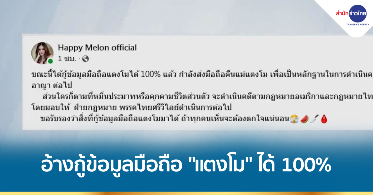 สำนักข่าวไทยยังคงเกาะติดคดีการเสียชีวิตของ “แตงโม” นักแสดงชื่อดัง ล่าสุดแฟนเพจ “Happy Melon official” ซึ่งเป็นเฟซบุ๊กที่โพสต์ขึ้นโดย “บังแจ็ค” ได้แจ้งข่าวว่า ขณะนี้สามารถกู้ข้อมูลในโทรศัพท์ของ “แตงโม” ได้ 100 เปอร์เซ็นต์แล้ว และกำลังส่งมือถือคืน “แม่แตงโม” เพื่อเป็นหลักฐานในการดำเนินคดีอาญา ส่วนใครก็ตามที่หมิ่นประมาท หรือคุกคามชีวิตส่วนตัวจะดำเนินคดีตามกฎหมายสหรัฐและกฎหมายไทย
