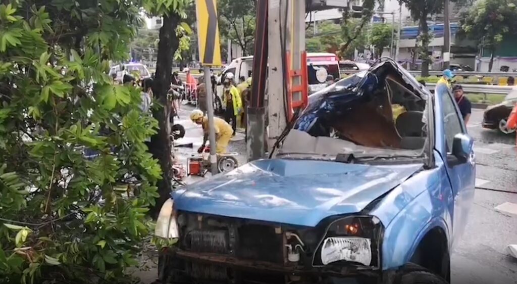 เมื่อช่วงเช้าที่ผ่านมา เกิดอุบัติเหตุ รถกระบะพลิกคว่ำบนถนนรัชดาภิเษก ฝั่งขาเข้า บริเวณหน้าศาลอาญา ตำรวจ สน.พหลโยธิน เข้าตรวจสอบที่เกิดเหตุ พบรถกระบะสีฟ้า มีคอกเหล็ก อยู่ในสภาพถูกอัดกับเสาไฟฟ้า พบร่างคนขับและผู้โดยสารนั่งข้างคนขับ เสียชีวิตติดอยู่ภายในรถ และผู้บาดเจ็บ เป็นหญิงอีก 2 คน นั่งอยู่หลังคนขับ และยังพบร่างผู้เสียชีวิตกระเด็นออกมาอีก 3 ศพ ทั้งหมดถูกนำส่งนิติเวชโรงพยาบาลตำรวจ บริเวณโดยรอบยังพบหมวกคนงานก่อสร้าง หม้อข้าว อาหาร รองเท้ากระจัดกระจายเต็มถนน ตำรวจต้องปิดถนนเพื่อช่วยเหลือและกู้ซาก ทำให้การจราจรติดขัดยาวไปจนเกือบถึงทางต่างระดับรัชวิภา