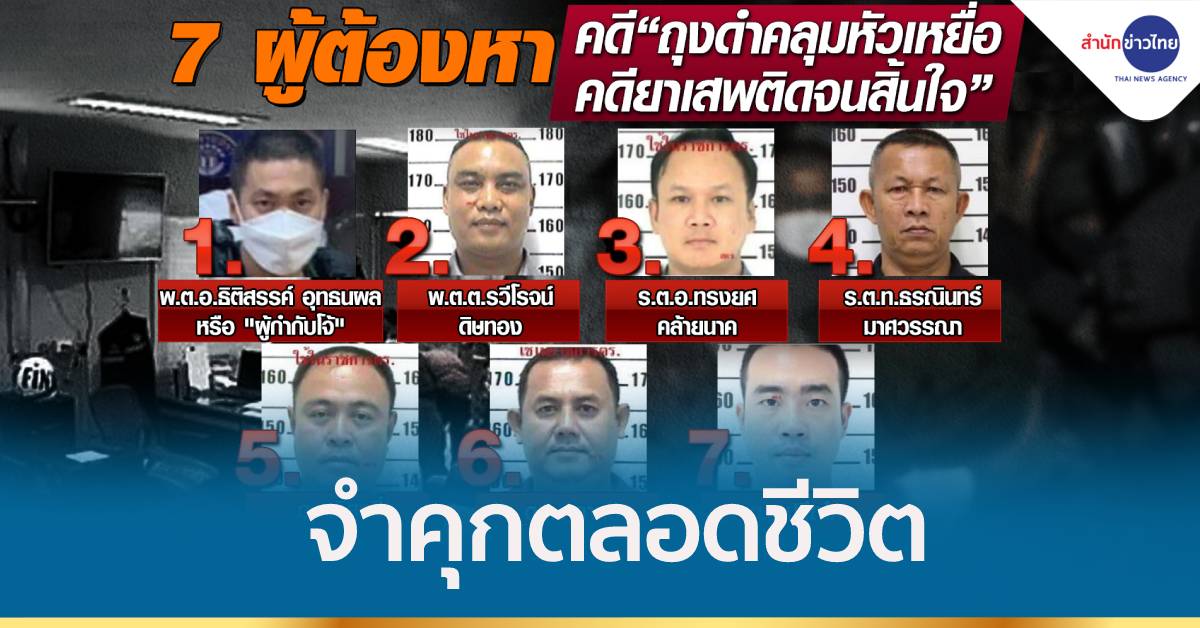 กทม. 8 มิ.ย. – ศาลสั่งจำคุกตลอดชีวิต อดีต ผกก.โจ้ และลูกน้องอีก 5 คน คดีใช้ถุงดำคลุมหัว ส่วนจำเลยที่ 6 ลงโทษจำคุก 5 ปี 4 เดือน เนื่องจากไม่มีหลักฐานประจักษ์ว่าได้ร่วมกันฆ่าผู้อื่นอย่างทารุณกรรมโหดร้าย