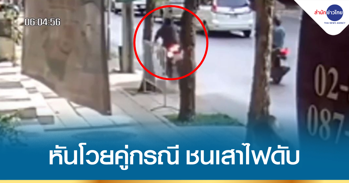 คลิปวงจรปิดเผยจังหวะรถจักรยานยนต์คันหนึ่งพุ่งชนเสาไฟฟ้า จนคนขี่ล้มลง เหตุเกิดในท้องที่ สน.ราษฎร์บูรณะ เจ้าหน้าที่ตำรวจ กู้ภัย และหน่วยงานที่เกี่ยวข้อง เข้าตรวจสอบ