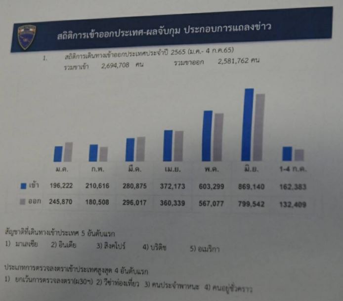 พล.ต.ท.ภาคภูมิภิภัทฒ์ สัจจพันธุ์ ผู้บัญชาการสำนักงานตรวจคนเข้าเมือง เปิดเผยว่า ตั้งแต่วันที่ 1 ก.ค.ที่ผ่านมา ซึ่งประเทศไทยเปิดรับนักท่องเที่ยวอย่างเป็นทางการ พบว่ามีนักท่องเที่ยวต่างชาติเดินทางเข้าไทยอย่างต่อเนื่อง โดย 5 อันดับแรก ได้แก่ มาเลเซีย อินเดีย สิงคโปร์ บริติช และอเมริกา ซึ่งตั้งแต่วันที่ 1-4 กรกฎาคม 2565 มีผู้เดินทางเข้าประเทศไทยแล้ว 162,383 คน เดินทางออก 132,409 คน ซึ่งมากขึ้นกว่าเดือนมิถุนายนเกือบ 50% โดยเดือนมิถุนายนทั้งเดือน มีผู้เดินทางเข้าประเทศ 869,140 คน