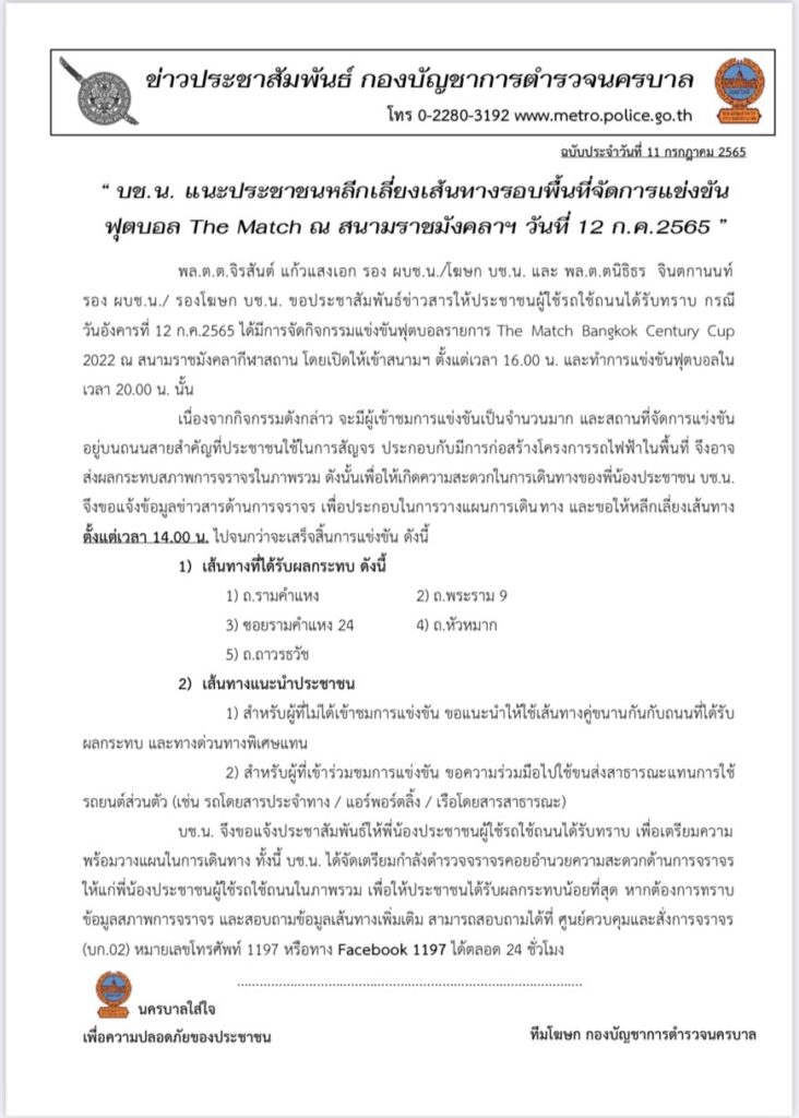 พล.ต.ต.จิรสันต์ แก้วแสงเอก รอง ผบช.น./โฆษก บช.น. และ พล.ต.ตนิธิธร จินตกานนท์ รอง ผบช.น./รองโฆษก บช.น. ขอประชาสัมพันธ์ข่าวสารให้ประชาชนผู้ใช้รถใช้ถนนได้รับทราบ กรณีวันอังคารที่ 12 ก.ค. 2565 ได้มีการจัดกิจกรรมแข่งขันฟุตบอลรายการ THE MATCH Bangkok Century Cup 2022 ณ สนามราชมังคลากีฬาสถาน โดยเปิดให้เข้าสนามฯ ตั้งแต่เวลา 16.00 น. และทำการแข่งขันฟุตบอลในเวลา 20.00 น. นั้น
