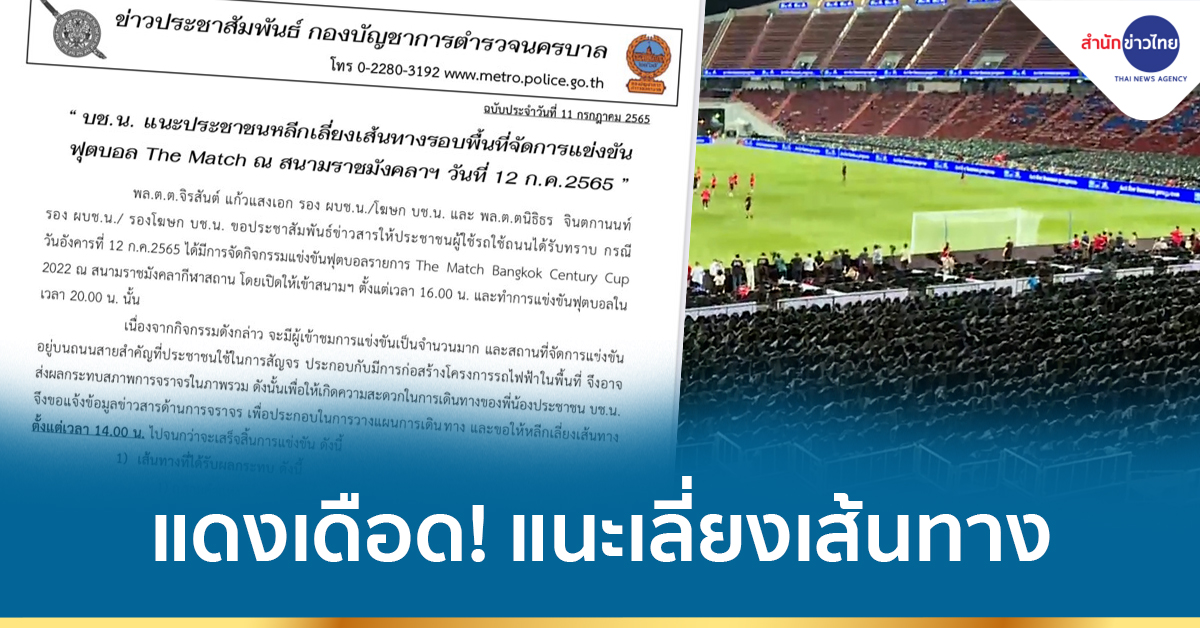 กทม. 12 ก.ค.- บช.น. แนะประชาชนหลีกเลี่ยงเส้นทางรอบพื้นที่จัดการแข่งขันฟุตบอล THE MATCH Bangkok Century Cup 2022 ณ สนามราชมังคลากีฬาสถาน หัวหมาก วันนี้ (12 ก.ค. 65)