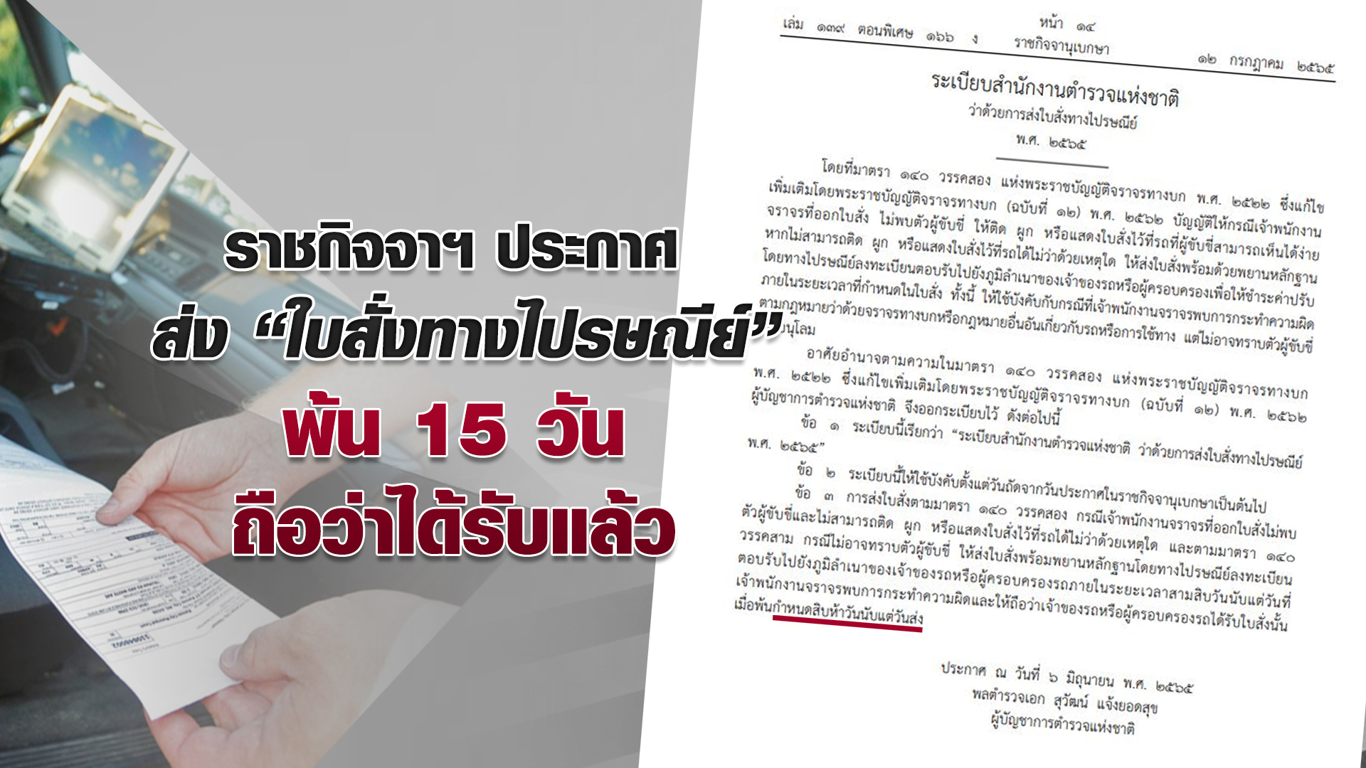 กรุงเทพฯ 14 ก.ค. – ผู้ขับขี่หมดสิทธิอ้าง ไม่ได้รับใบสั่งทางไปรษณีย์ หลังราชกิจจานุเบกษา ออกประกาศ พ้น 15 วัน ถือว่าผู้ขับขี่ได้รับใบสั่ง ด้านตำรวจรับลูก เตือนผู้ขับขี่ทำผิด ไม่อยากโดนหมายเรียกหรือหมายจับ ได้รับใบสั่งทางไปรษณีย์ ให้รีบมาเสียค่าปรับ