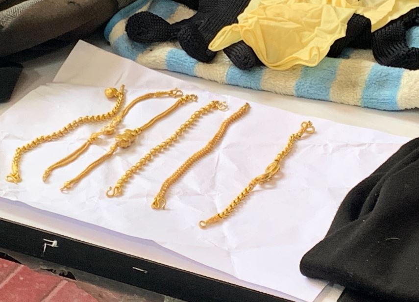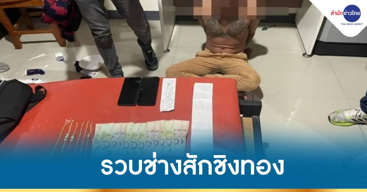 กรุงเทพฯ 20 ก.ค.-พล.ต.ท.สำราญ นวลมา ผบช.น. แถลงผลการจับกุม นายประภากร อายุ 42 ปี อาชีพช่างสัก พร้อมของกลาง สร้อยข้อมือทองคำ 6 เส้น น้ำหนัก 6 บาท และเงินสด 12,550 บาท หลังจากก่อเหตุบุกเดี่ยวชิงทรัพย์ร้านทองในห้างโลตัส ย่านพัฒนาการ ได้สร้อยข้อมือและสร้อยคอทองคำ รวม 33 เส้น น้ำหนัก 45 บาท มูลค่า 1.5 ล้านบาท ก่อนหลบหนีไป