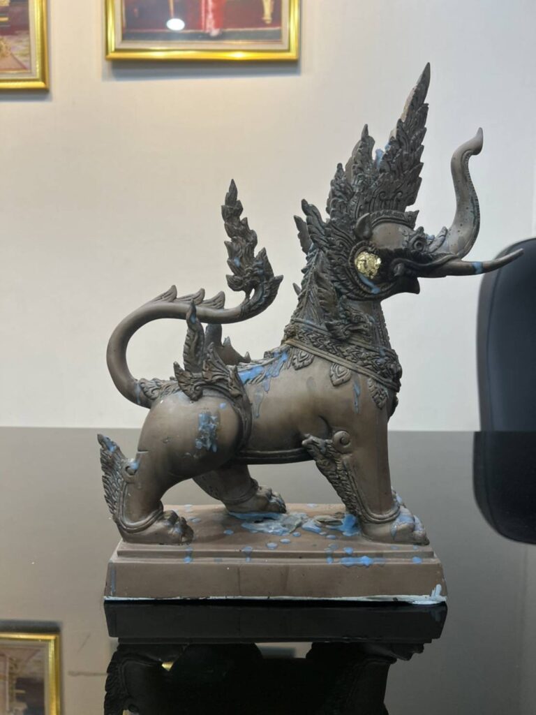 จากกรณีที่มีผู้ก่อเหตุโจรกรรม “พญาคชสีห์ราชเสนีพิทักษ์” ที่ตั้งอยู่บริเวณซุ้มหน้าอาคารสำนักงานสถาบันเทคโนโลยีป้องกันประเทศ (สทป.) กระทรวงกลาโหม สร้างด้วยเนื้อโลหะความสูงประมาณ 10 นิ้ว ยาว 8 นิ้ว เมื่อวันที่ 28 กรกฎาคมที่ผ่านมา ล่าสุด พันตำรวจเอกกัณฑภณ โพธิ์อ๊ะ ผู้กำกับการสถานีตำรวจนครบาลวังทองหลาง เปิดเผยว่า ได้รับแจ้งจากเจ้าของร้านก๋วยเตี๋ยวภายในซอยลาดพร้าว 112 ว่า พบของกลางลักษณะคล้ายกับที่หายไป จึงโทรศัพท์แจ้งให้ตำรวจ สน.วังทองหลาง มารับไปตรวจสอบและประสานให้ตำรวจสืบสวนนครบาล ร่วมสืบสวนหาผู้ก่อเหตุ