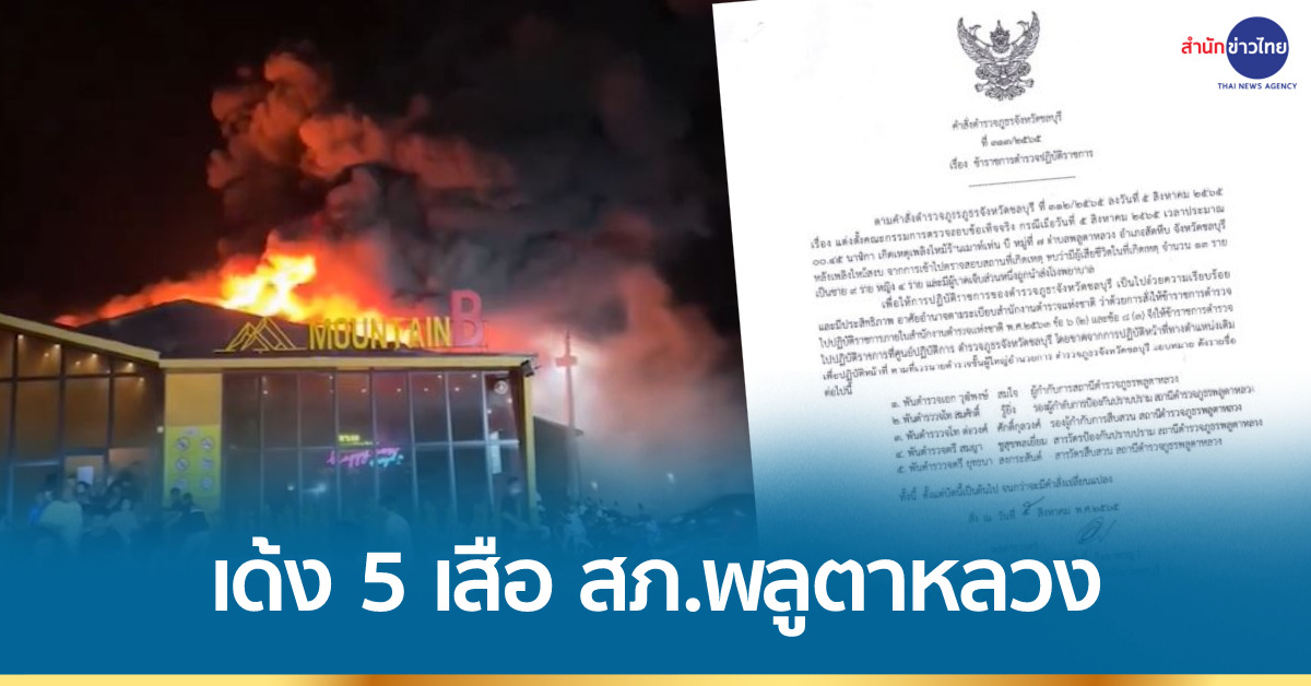 ชลบุรี 5 ส.ค. – เด้ง 5 เสือ สภ.พลูตาหลวง ขาดจากตำแหน่งเดิม เซ่นไฟไหม้ผับ Mountain B ดับ 14 ราย เจ็บ 35 ราย มีเยาวชนใช้บริการ