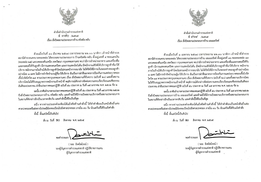 และมีคำสั่งที่ 369/2565 สั่งปิดสถานประกอบการร้าน เอมเมอรัลด์ ซ.ทองหล่อ 13 แขวงคลองตันเหนือ เขตวัฒนา และคำสั่งที่ 370/2565 เรื่อง สั่งปิดสถานประกอบการร้าน คริสตัล คลับ ซ.แสงเงิน (ทองหล่อ 25) แขวงคลองตันเหนือ เขตวัฒนา กรุงเทพมหานคร พบว่ามีการจำหน่ายอาหาร และเครื่องดื่ม แอลกอฮอล์ให้กับลูกค้า มีการแสดงดนตรีสด และการแสดงโชว์เต้น มีพนักงานเสิร์ฟให้บริการลูกค้าที่มาใช้บริการ พนักงานภายในร้านให้บริการลูกค้าโดยไม่สวมหน้ากากอนามัย ไม่ได้จัดให้มีการเว้นระยะห่างของลูกค้าอย่างน้อย 1 เมตร ไม่มีการจำกัดจำนวนผู้ที่มาใช้บริการ อันเป็นการฝ่าฝืนมาตรการป้องกันการแพร่ระบาดของเชื้อไวรัสโควิด-19 ตามประกาศกรุงเทพมหานคร เรื่อง สั่งปิดสถานที่ชั่วคราว (ฉบับที่ 20) และตั้งสถานบริการโดยไม่ได้รับอนุญาตจากพนักงานเจ้าหน้าที่ พฤติการณ์ดังกล่าวขัดต่อความสงบเรียบร้อยและศีลธรรม อันดีของประชาชน ฝ่าฝืนประกาศคณะปฏิวัติ ฉบับที่ 50 ประกาศ ณ วันที่ 15 มกราคม พ.ศ.2502 ข้อ 2