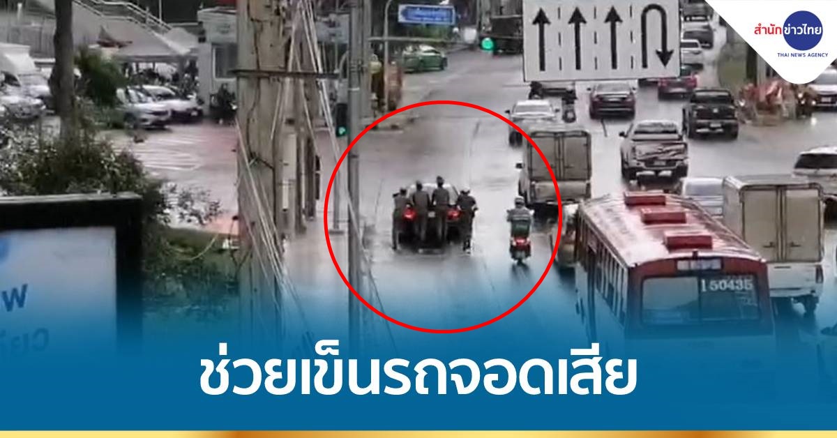 กรุงเทพฯ 17 ส.ค.-ชื่นชม! ตำรวจ สน.ห้วยขวาง ช่วยเข็นรถจอดเสียท่ามกลางสายฝน เพื่อให้พ้นผิวการจราจร บริเวณถนนรัชดาฯ ใกล้สามแยกเทียมร่วมมิตร ลดปัญหาจราจรติดขัด
