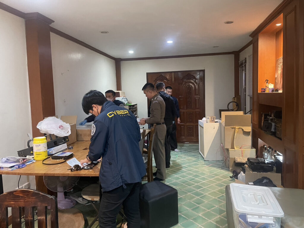 ต่อมาเจ้าหน้าที่ตำรวจ บก.สอท.2 ได้นำกำลังพร้อมหมายค้นศาลอาญาเข้าตรวจค้นเป้าหมายจำนวน 2 จุด ในพื้นที่กรุงเทพฯ จุดที่ 1 เป็นห้องพักชั้น 3 ภายในคอนโดแห่งหนึ่ง พื้นที่แขวงดอนเมือง เขตดอนเมือง และจุดที่ 2 เป็นบ้านพักในหมู่บ้านหรูแห่งหนึ่งในซอยรามอินทรา 34 แยก 15 แขวงท่าแร้ง เขตบางเขน ผลการตรวจค้น สามารถจับกุมผู้ต้องหาได้ 3 ราย ได้แก่ 1.นายอมร อายุ 31 ปี นักแสดงประกอบละครของช่องดัง ทำหน้าที่จดทะเบียนบริษัท เปิดบัญชีนิติบุคคลและเบิกถอนเงินสดผ่านเคาน์เตอร์ธนาคาร 2.นายอิศรา อายุ 37 ปี ทำหน้าที่เป็นผู้เบิกถอนเงินสดผ่านเคาน์เตอร์ธนาคาร และ 3.นายไพรัช อายุ 38 ปี ทำหน้าที่เป็นผู้รับเงินต่อจากนายอมร พร้อมกันนี้สามารถตรวจยึดของกลาง อาทิ รถยนต์ 5 คัน, สมุดบัญชีธนาคาร 46 เล่ม, บัตรกดเงินสด 6 ใบ, โทรศัพท์มือถือ 10 เครื่อง ฯลฯ รวมมูลค่าของกลางที่ตรวจยึดได้ทั้งหมด ประมาณ 10.5 ล้านบาท