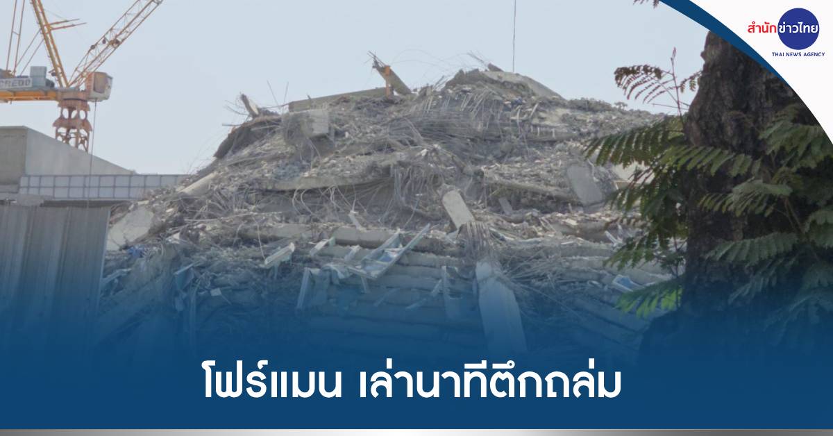 กทม. 28 มี.ค.-โฟร์แมนคุมผู้รับเหมา เผยได้ยินเสียงพื้นปูนลั่น แต่ยังไม่ทราบว่าเกิดที่ชั้นใด จึงรีบวิ่งออกมา สักพักมองบนดาดฟ้าเห็นเครนที่กำลังทำงายส่ายไปมา จากนั้นเพียง 10 นาที อาคารก็ถล่มในแนวดิ่ง ขณะนั้นคนงานที่ทำงานอยู่ด้านใน มีอยู่ประมาณ 170 คน