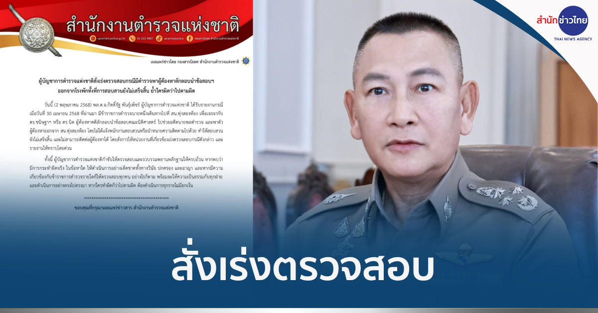 กทม. 2 พ.ค. – ผบ.ตร. สั่งเร่งตรวจสอบกรณีมีตำรวจพาผู้ต้องหาลักลอบนำข้อสอบฯ ออกจากโรงพัก ทั้งที่การสอบสวนยังไม่เสร็จสิ้น ย้ำใครผิดว่าไปตามผิด