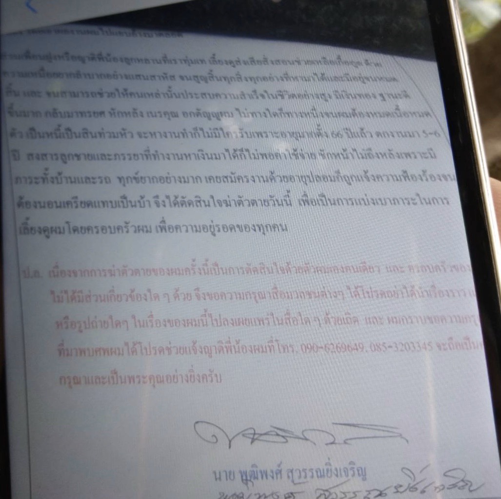ตำรวจ สน.ตลิ่งชัน เข้าตรวจสอบ รถเก๋ง สีบรอนซ์เงิน ทะเบียน ศอ 2606 กรุงเทพฯ จอดสตาร์ทเครื่องเปิดแอร์ทิ้งไว้ ในปั๊มน้ำมันแห่งหนึ่ง ถนนกาญจนาภิเษกฝั่งขาเข้า เขตตลิ่งชัน พบร่าง นายพุฒิพงศ์ สุวรรณยิ่งเจริญ อายุ 66 ปี นอนหมดสติอยู่ในรถ จึงประสานหน่วยกู้ชีพมูลนิธิร่วมกตัญญู ช่วยปั๊มหัวใจกว่า 30 นาที แต่ไม่เป็นผลเสียชีวิตในเวลาต่อมา ตรวจสอบในรถ ยังพบมีการจุดเตาถ่านวางอยู่บนเขียงไม้ ที่เบาะหลังด้านซ้าย มีถุงถ่านหุงข้าว 1 ถุง ขวดเหล้าขาว 1ขวด ที่ คอนโซลหน้ารถพบจดหมายลาตาย 1 ฉบับ ระบุ “ทำงานเป็นพนักงานบริษัท ซึ่งที่ผ่านมา ทำให้บริษัทเจริญรุ่งเรืองมามาก แต่ก็ถูกคนใกล้ตัวกลั่นแกล้ง หักหลัง ให้ออกจากงาน ตกงานมา5-6 ปีแล้ว เป็นภาระให้ลูกเมียต้องดูแล สร้างหนี้สินไว้มาก หาเงินได้เท่าใดก็ไม่พอใช้หนี้ ไปสมัครงานที่ไหนก็ไม่มีใครรับ เพราะอายุมากและยังมีคดีความติดตัว เพราะปลอมอายุไปสมัครงาน เครียดหนักทุกวัน และที่ก่อเหตุในครั้งนี้เพื่อเป็นการลดภาระให้กับครอบครัว โดยคนในครอบครัวไม่มีส่วนเกี่ยวข้องกับการตายในครั้งนี้” เจ้าหน้าที่จึงเก็บไว้เป็นหลักฐาน