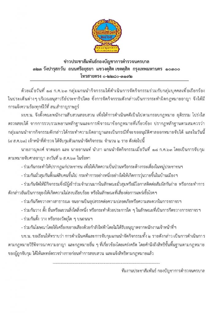 บช.น. ขอเรียนให้ทราบว่า การดำเนินคดีและการจับกุมแกนนำจัดกิจกรรมทั้ง ๒ รายดังกล่าว เป็นการดำเนินการตามกฎหมายวิธีพิจารณาความอาญา และกฎหมายอื่น ๆ ที่เกี่ยวข้องโดยเคร่งครัด โดยคำนึงถึงสิทธิขั้นพื้นฐานตามกฎหมายของผู้ถูกจับกุม ได้ให้แพทย์ตรวจร่างกายก่อนทำการสอบสวน พนักงานสอบสวนได้แจ้งสิทธิตามกฎหมาย และจะปฏิบัติตามระเบียบการควบคุมตัว ตลอดจนการฝากขังต่อศาล .-สำนักข่าวไทย