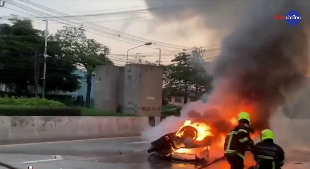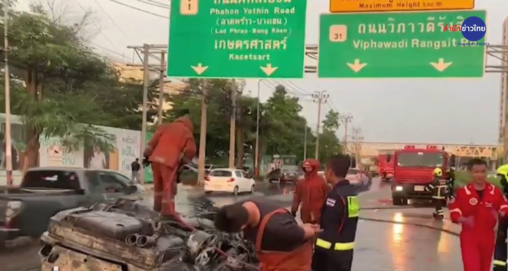 เหตุเกิดเมื่อเวลาประมาณ 06.00 น.ที่ผ่านมา บนถนนประเสริฐมนูกิจ ช่วงก่อนทางลงอุโมงค์เกษตรมุ่งหน้างามวงศ์วาน ตำรวจ สน.บางเขน กทม. เจ้าหน้าที่พร้อมรถน้ำดับเพลิง ตรวจสอบที่เกิดเหตุ พบรถหรูสีบรอนซ์เทา ทะเบียน จก 4000 กรุงเทพมหานคร พลิกคว่ำล้อชี้ฟ้าอยู่กลางถนน เพลิงไหม้เสียหายทั้งคัน เจ้าหน้าที่ฉีดน้ำนานกว่า 10 นาทีเพลิงจึงสงบลง