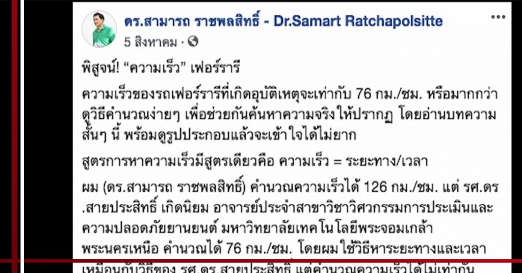 ขณะที่นายสธน วิจารณ์วรรณลักษณ์ อาจารย์ประจำภาควิชาฟิสิกส์ คณะวิทยาศาสตร์ จุฬาลงกรณ์มหาวิทยาลัย เปิดเผยว่าได้ให้ปากคำกับพนักงานสอบสวนไปแล้วเช่นกัน ในประเด็นความเร็วของรถที่ใช้สูตรการคำนวนความเร็วเท่ากับระยะทางหารด้วยเวลา คำนวนได้ 177 กิโลเมตรต่อชั่วโมง