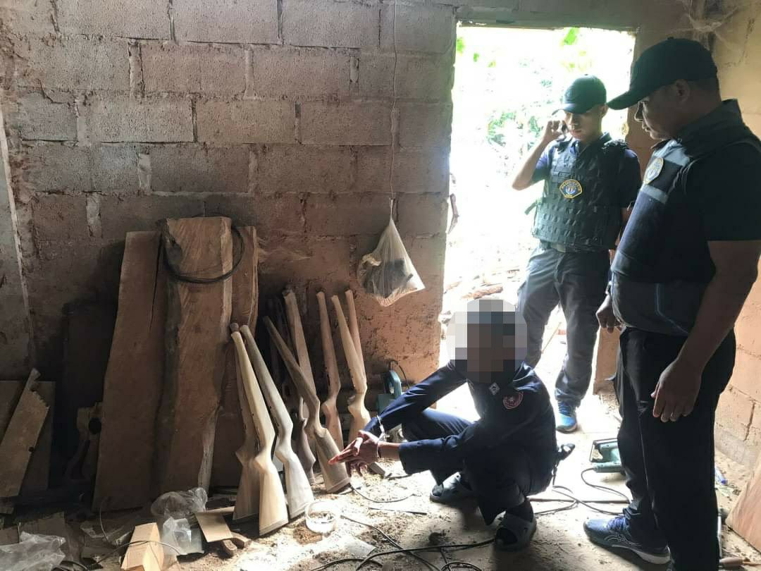 นายธนัทนันท์ (สงวนนามสกุล) อายุ 26 ปี นายขันตรี (สงวนนามสกุล) อายุ 37 ปี และนายกนกพล (สงวนนามสกุล) อายุ 19 ปี ผู้ต้องหาหมายจับศาลอาญาข้อหา“ร่วมกันทำ ประกอบซ่อมแซม เปลี่ยนลักษณะ สั่ง นำเข้า มีหรือจำหน่ายซึ่งอาวุธปืนหรือเครื่องกระสุนปืนสำหรับการค้า โดยไม่ได้รับอนุญาต” “ร่วมกันทำ ประกอบซ่อมแซม เปลี่ยนลักษณะ สั่ง นำเข้า มีหรือจำหน่ายซึ่งอาวุธปืนหรือเครื่องกระสุนปืนสำหรับการค้า โดยไม่ได้รับอนุญาต” ถูกตำรวจกองปราบจับกุม พร้อมยึดของกลาง 1. อาวุธปืนเถื่อน (ไทยประดิษฐ์) ลักษณะเป็นปืนยาวขนาด .22 แอลอาร์ และขนาด .22 แม็กนั่ม จำนวน 120 กระบอก 2. ลำกล้องปืน จำนวน 82 ชิ้น 3. ชุดลั่นไกและลูกเลื่อน จำนวน 9 ชุด 4. พันท้ายปืน จำนวน 12 ชิ้น 5. โก่งไกปืน จำนวน 31 อัน 6. ซองกระสุนปืน จำนวน 39 อัน และ7. เครื่องกระสุนปืน 2,216 นัด