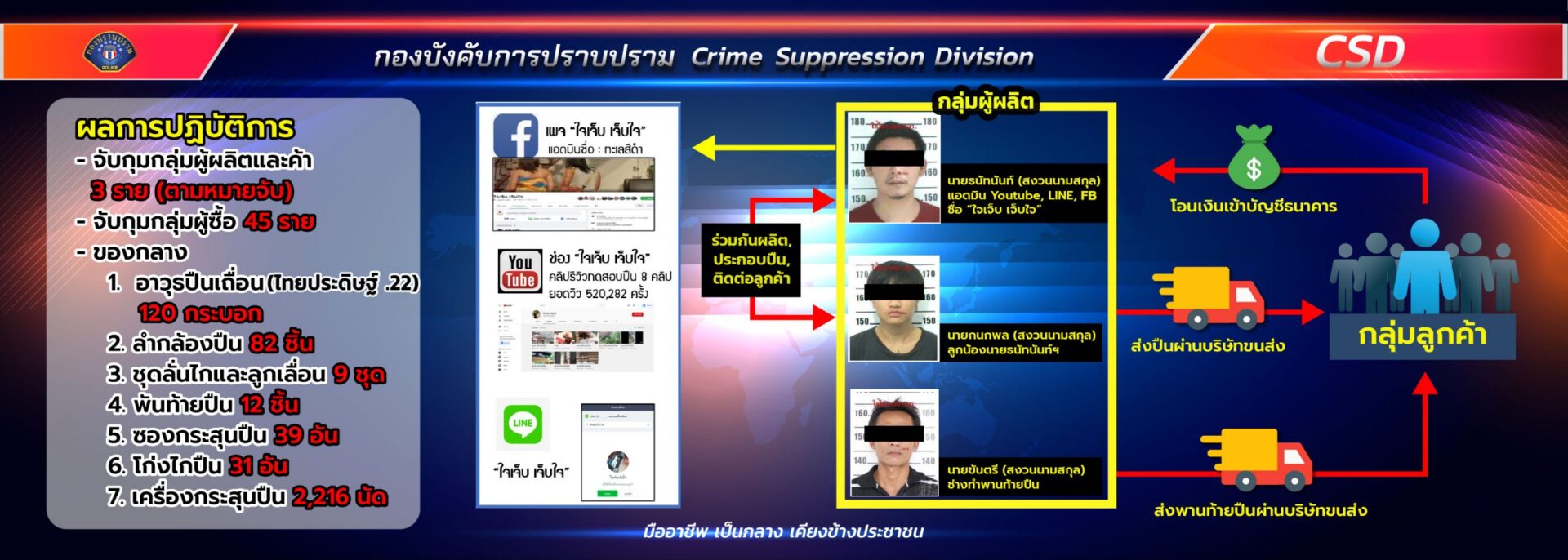 ต่อมาเจ้าหน้าที่ตำรวจกองกำกับการ 5 กองบังคับการปราบปราม จึงได้แฝง ตัวเข้าไปทำการล่อซื้ออาวุธปืนเถื่อนจากผู้ใช้ที่ชื่อว่า “ใจเจ็บ เจ็บใจ” โดยสั่งซื้ออาวุธปืนจำนวน 2 กระบอกพร้อมท่อเก็บเสียง และได้ทำการสืบสวนจนทราบว่า ผู้ขายที่ใช้ไลน์ชื่อ “ใจเจ็บ เจ็บใจ” คือ นายธนัทนันท์ (ผู้ต้องหาที่ ๑) และมีผู้ร่วมขบวนการ คือ นายกนกพล (ผู้ต้องหาที่ ๒) และนายขันตรี (ผู้ต้องหาที่ ๓) โดย นายธนัทนันท์ฯ และนายกนกพลฯ ทำหน้าที่ติดต่อซื้อขายกับลูกค้า, ประกอบชิ้นส่วนอาวุธปืนและบรรจุอาวุธปืนใส่กล่องเพื่อส่งพัสดุให้กับลูกค้าผ่านทางบริษัท ขนส่งเอกชน โดยมีการเปิดร้านขายอุปกรณ์ตกปลาบังหน้าเพื่อความสะดวกต่อการส่งพัสดุ ส่วนนายขันตรีฯ ทำหน้าที่เป็นช่างทำพานท้ายปืน และจัดส่งพานท้ายปืน ผ่านทางบริษัทขนส่งเอกชนให้กับลูกค้าตามคำสั่งของนายธนัทนันท์ฯ