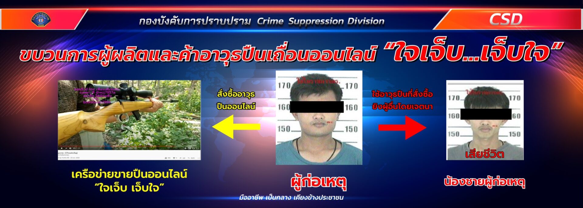 ทางกองกำกับการ ๕ กองบังคับการปราบปราม จึงได้สืบสวนขยายผลที่มาของอาวุธปืนยาว ขนาด .22 ที่นายณัฐพงษ์ หรือน็อต (สงวนนามสกุล) ใช้ยิงผู้อื่นเสียชีวิต ในท้องที่ สภ.สองพี่น้อง จ.สุพรรณบุรี เมื่อวันที่ 15 กรกฎาคม 2563 โดยสืบสวนทราบว่า อาวุธปืนดังกล่าวซื้อมาจากผู้ขายอาวุธปืนเถื่อนออนไลน์ผ่านทางแอปพลิเคชั่นไลน์ชื่อ “ใจเจ็บ เจ็บใจ” และนอกจากนี้ยังมี Youtube ช่อง “ใจเจ็บ เจ็บใจ” ซึ่งเป็นช่องทางที่กลุ่มผู้ผลิตและค้าอาวุธปืนเถื่อนออนไลน์ใช้ในการรีวิวขายอาวุธปืน โดยในวิดีโอดังกล่าวได้ให้ข้อมูลไอดีไลน์สำหรับติดต่อสั่งซื้ออาวุธปืน และ จะทำการจัดส่งพัสดุมายังที่บ้านของผู้ซื้อ
