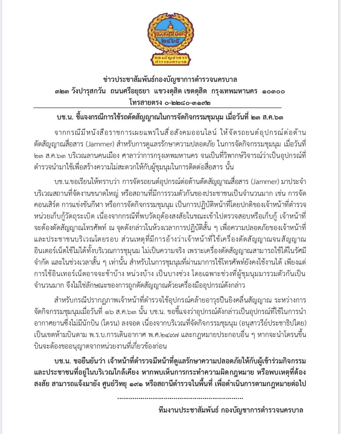 บช.น.ขอเรียนให้ทราบว่า การจัดรถยนต์อุปกรณ์ต่อต้านตัดสัญญาณสื่อสาร (Jammer) มาประจํา บริเวณสถานที่จัดงานขนาดใหญ่ หรือสถานที่มีการรวมตัวกันของประชาชนเป็นจํานวนมาก เช่น การจัด คอนเสิร์ต การแข่งขันกีฬา หรือการจัดกิจกรรมชุมนุม เป็นการปฏิบัติหน้าที่โดยปกติของเจ้าหน้าที่ตํารวจ หน่วยเก็บกู้วัตถุระเบิด เนื่องจากกรณีที่พบวัตถุต้องสงสัยในขณะเข้าไปตรวจสอบหรือเก็บกู้ เจ้าหน้าที่ จะต้องตัดสัญญาณโทรศัพท์ ณ จุดดังกล่าวในห้วงเวลาการปฏิบัติสั้น ๆ เพื่อความปลอดภัยของเจ้าหน้าที่ และประชาชนบริเวณโดยรอบ ส่วนเหตุที่มีการอ้างว่าเจ้าหน้าที่ใช้เครื่องตัดสัญญาณ จนสัญญาณอินเตอร์เน็ตใช้ไม่ได้ทั้งบริเวณการชุมุนม ไม่เป็นความจริง เพราะเครื่องตัดสัญญาณสามารถใช้ได้ในรัศมี จํากัด และในช่วงเวลาสั้น ๆ เท่านั้น สําหรับในการชุมนุมที่ผ่านมาการใช้โทรศัพท์ยังคงใช้งานได้ เพียงแต่ การใช้อินเทอร์เน็ต อาจจะช้าบ้าง หน่วงบ้าง เป็นบางช่วง โดยเฉพาะช่วงที่ผู้ชุมนุมมารวมตัวกันเป็น จํานวนมาก จึงไม่ใช่ลักษณะของการถูกตัดสัญญาณด้วยเครื่องมืออุปกรณ์ดังกล่าว