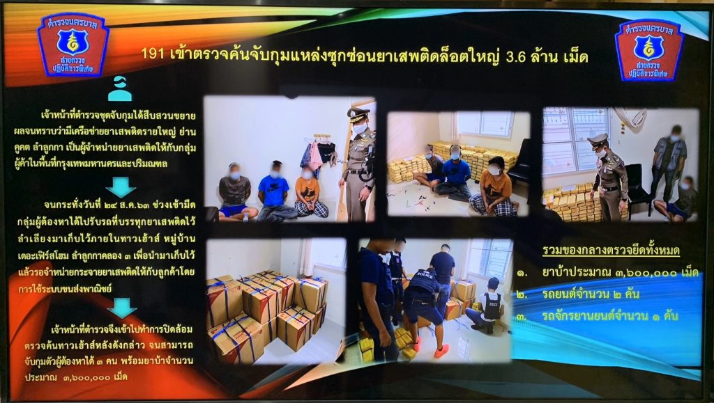 ทั้งนี้ การจับกุมดังกล่าว เป็นการขยายผล หลังเมื่อวันที่ 5 มิถุนายน ที่ผ่านมา ตำรวจ 191 ได้ จับกุม เครือข่าย รายย่อย ย่านสายไหม พร้อมกลางยาบ้า 1 แสน 9 หมื่นเม็ด จากนั้นจึงขยายผล และ เฝ้าติดตามความเคลื่อนไหวของเครือข่าย ดังกล่าว จนพบ เมื่อวันที่ 24 สิงหาคม กลุ่มผู้ต้องหา ได้ไปรับรถที่จอดทิ้งไว้ริมถนนลำลูกกา ซึ่งภายในรถบรรจุยาเสพติด อยู่ในกล่องกระดาษ และขนมาเก็บไว้ที่บ้านเลขที่ 199/204 หมู่บ้านแห่งหนึ่งต.คูตค เพื่อรอกระจาย ให้กับลูกค้ารายย่อย ผ่านทางระบบขนส่งพาณิชย์ จึงนำกำลังเข้าจับกุมผู้ต้องหา ทั้ง 3 พร้อมยึด ยาบ้า 3.6 ล้านเม็ด เบื้องต้น นำตัวส่งดำเนินคดีที่ บช.ปส. ในข้อหา ร่วมกันมียาเสพติด ให้โทษไว้ในความครอบครองเพื่อจำหน่ายโดยผิดกฎหมาย