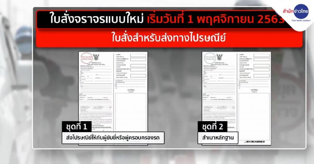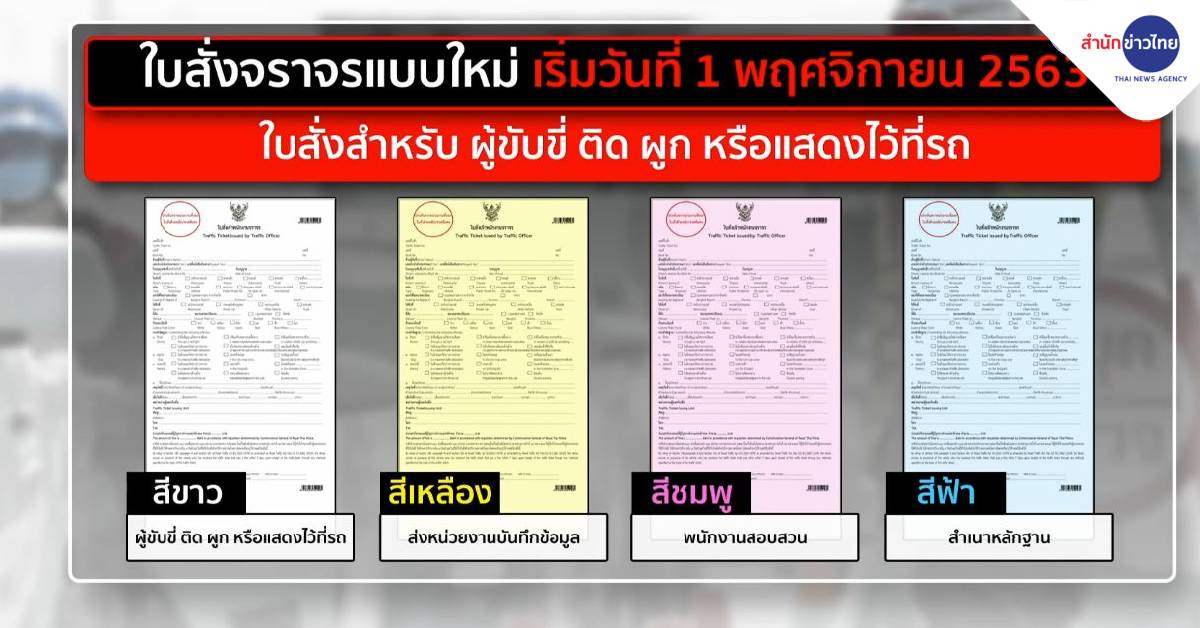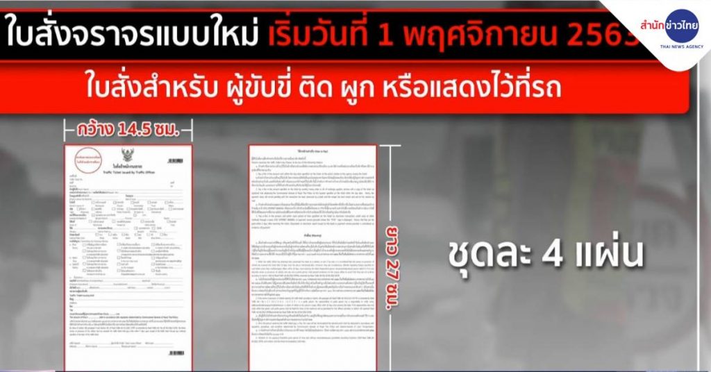 เว็บไซต์ราชกิจจานุเบกษาเผยแพร่ประกาศสำนักงานตำรวจแห่งชาติ ที่ลงนามโดย พล.ต.อ.จักรทิพย์ ชัยจินดา ผู้บัญชาการตำรวจแห่งชาติ เรื่องกำหนดแบบใบสั่งเจ้าพนักงานจราจร ใบสั่งแบบเดิมจะสิ้นสุดในวันที่ 31 ตุลาคม และจะใช้ใบสั่งแบบใหม่จะเริ่มใช้ในวันที่ 1 พฤศจิกายนนี้ ใบสั่งใหม่มี 2 แบบ คือ