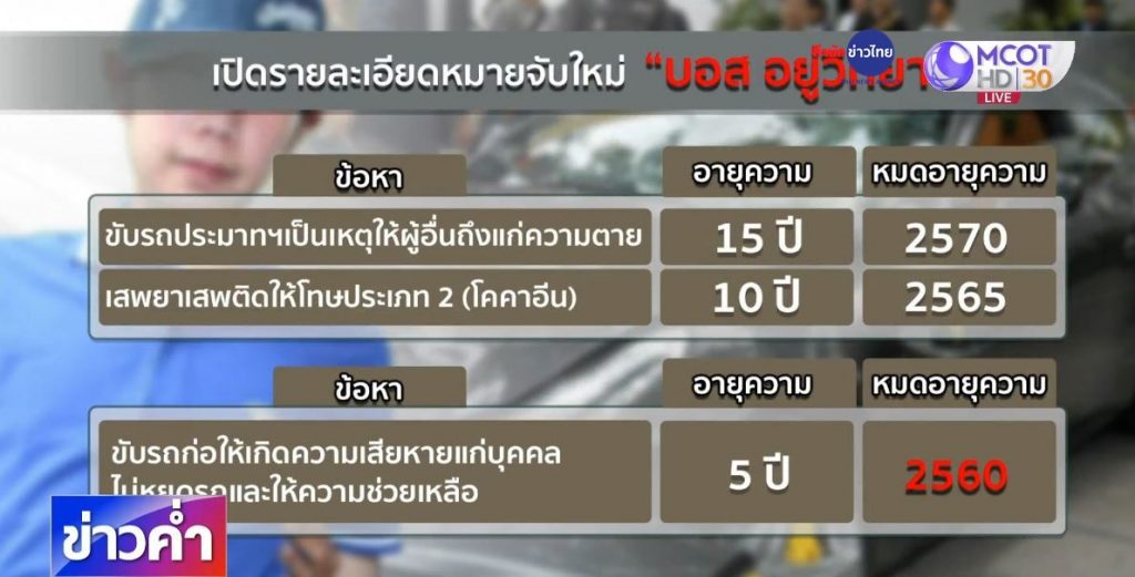 ก่อนหน้านี้ศาลอาญากรุงเทพใต้อนุมัติหมายจับนายวรยุทธ อยู่วิทยา หรือ “บอส” ในคดีขับรถชนตำรวจเสียชีวิตเมื่อปี 2555 ในความผิดฐานขับรถโดยประมาทเป็นเหตุให้ผู้อื่นถึงแก่ความตาย ซึ่งจะหมดอายุความในปี 2570 เสพยาเสพติดให้โทษประเภท 2 (โคคาอีน) หมดอายุความในปี 2565 และไม่หยุดรถให้ความช่วยเหลือ หมดอายุความไปแล้ว หมายจับนี้เนื่องจากพนักงานสอบสวนพบพยานหลักฐานใหม่อันสำคัญแก่คดี