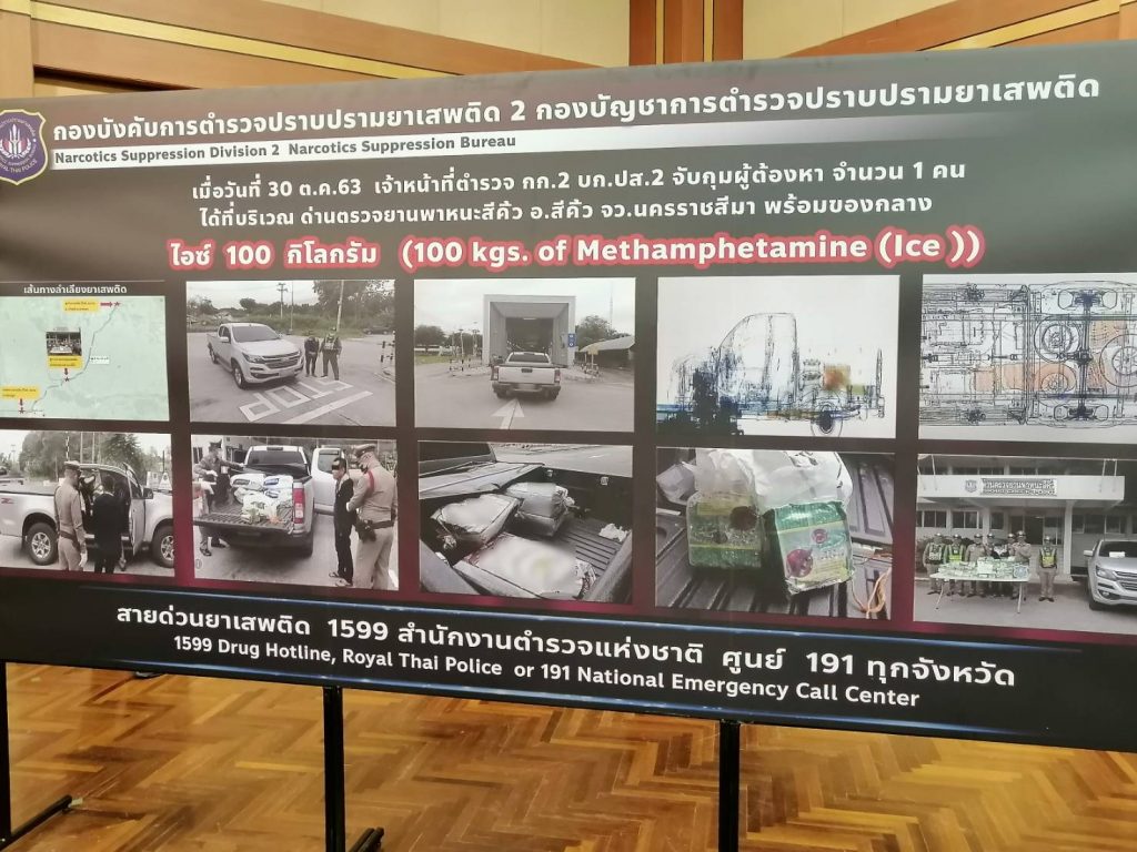 คดีที่ 2 จับกุมนายกล้า พัดคำตัน อายุ 46 ปี ชาวจังหวัดสกลนครพร้อมไอซ์น้ำหนักรวม 100 กิโลกรัม รถยนต์ 1 คัน โทรศัพท์มือถือ 1 เครื่อง โดยบกุมได้ที่บริเวณด่านตรวจยานพาหนะสีคิ้ว ถนนมิตรภาพ ตำบลลาดบัวขาว จังหวัดนครราชสีมา โดยการจับกุมสืบเนื่องมาจากตำรวจสืบทราบว่าเครือข่ายค้ายาเสพติด จะลำเลียงยาเสพติด โดยเฉพาะไอซ์ จากพื้นที่จังหวัดสกลนคร เข้ามาส่งให้ขบวนการค้ายาเสพติดในพื้นที่กรุงเทพฯ และปริมณฑลโ ดยใช้รถยนต์ 1 คันเป็นพาหนะในการลำเลียง และอีก 1 คันทำหน้าที่ นำทาง จึงตั้งด่าน กระทั่งพบรถยนต์ต้องสงสัย อย่างไรก็ตามเตรียมประสานหน่วยงานที่เกี่ยวข้องดำเนินการขยายผลจับกุมเครือข่ายค้ายาเสพติดที่เหลือต่อไป. -สำนักข่าวไทย