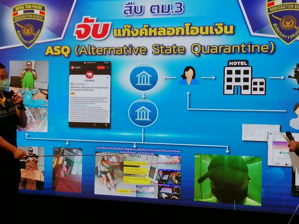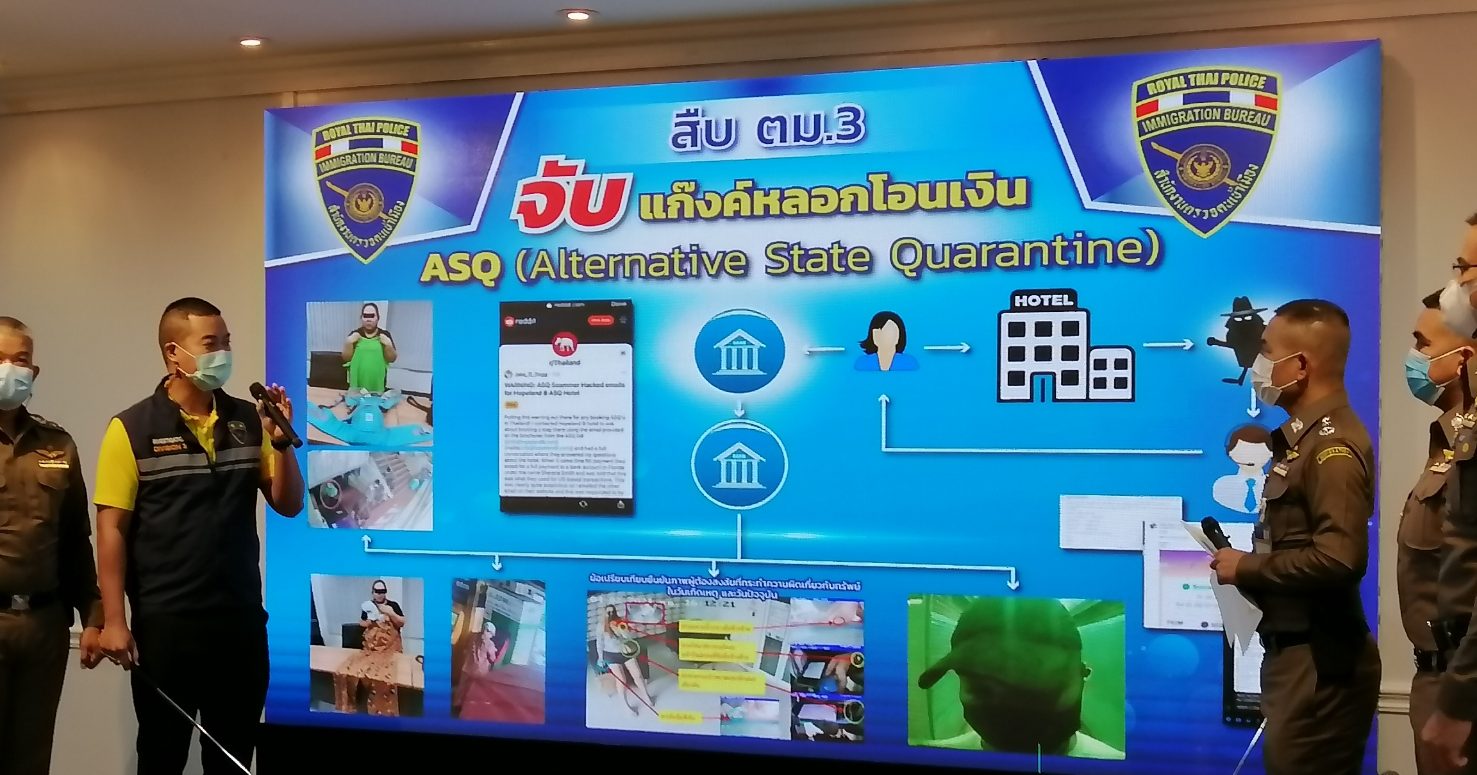 พลตำรวจโทสมพงษ์ ชิงดวง ผู้บัญชาการสำนักงานตรวจคนเข้าเมือง แถลงผลจับกุม นางสาวแอมมี่ สงวนนามสกุล มิฉาชีพอ้างเป็นผู้จัดการโรงแรมกักตัวทางเลือก หรือ Alternative state Quarantine หลอกให้ผู้เสียหายชาวแอฟริกาใต้โอนเงินค่าสถานที่กักตัว สูญเงินไปกว่า 35,000 บาท โดยคดีนี้ตำรวจได้รับแจ้งจากมารดาของผู้เสียหายชาวแอฟริกาใต้ ที่จะเดินทางเข้ามาในไทย และได้ติดต่อจองโรงแรมย่านสุขุมวิท เพื่อใช้เป็นสถานที่กักตัวผ่านทางเว็บไซต์ asq.wanderthai.com ต่อมามีคนร้ายอีเมล์มาแจ้งอ้างตัวว่าเป็นผู้จัดการโรงแรม และขอเก็บค่าธรรมเนียมเป็นเงิน 35,000 บาท เข้าบัญชีที่คนร้ายแจ้งมา จนกระทั่งมาทราบภายหลังว่าเป็นการแอบอ้าง ไม่ใช่การดำเนินการของทางโรงแรม แต่ก่อนหน้านี้อีเมล์ของโรงแรมถูกแฮ็กผ่านทาง Email spam จึงอาจเป็นเหตุให้คนร้ายทราบข้อมูลการจองของผู้เสียหายได้ โดยเบื้องต้นมีผู้เสียหายตกเป็นเหยื่อ 5-6 ราย รวมความเสียหาย 35,000 บาท