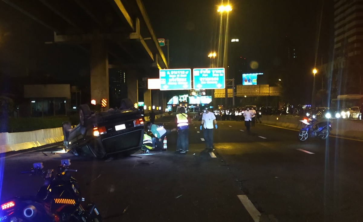 กรุงเทพฯ 10 ก.ย. – บช.น.แจงเหตุรถเก๋งพลิกคว่ำบน ถ.วิภาวดีฯ ขาออก เกิดจากมีผู้ชุมนุมกระโดดข้ามแบริเออร์เข้ามาในช่องทาง ทำให้รถเบรกกะทันหันและเสียหลักพลิกคว่ำ ไม่ได้เกิดจากรถจีโน่ฉีดน้ำ ตามที่สื่อโซเชียลโพสต์