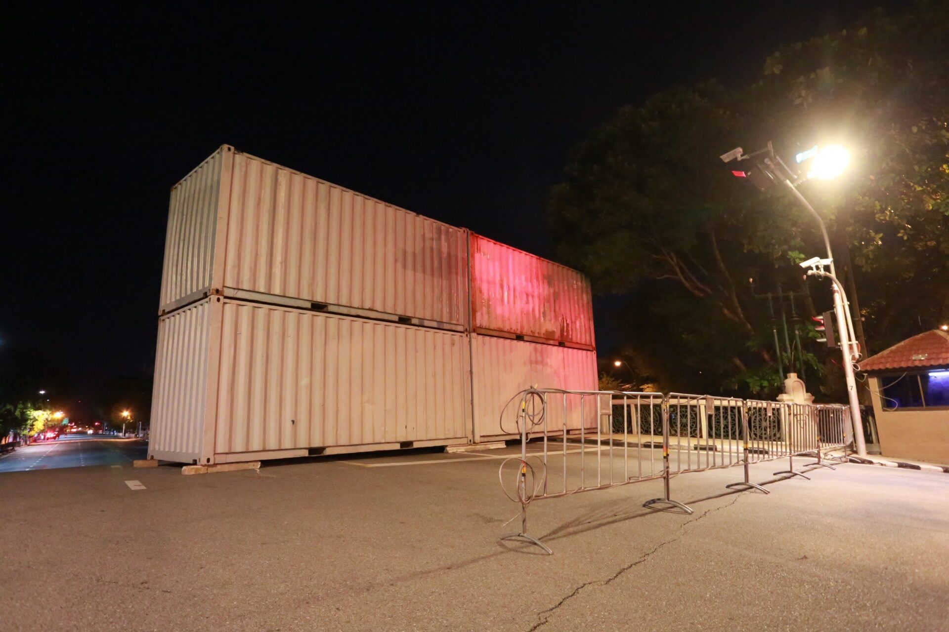 BANGKOK, Aug 23 (TNA) – Officials placed cargo containers to block roads in the vicinity of Government House to protect it from demonstrators who planned to gather there and other locations to demand the ouster of Prime Minister Prayut Chan-o-cha and to criticize the performance of his government.