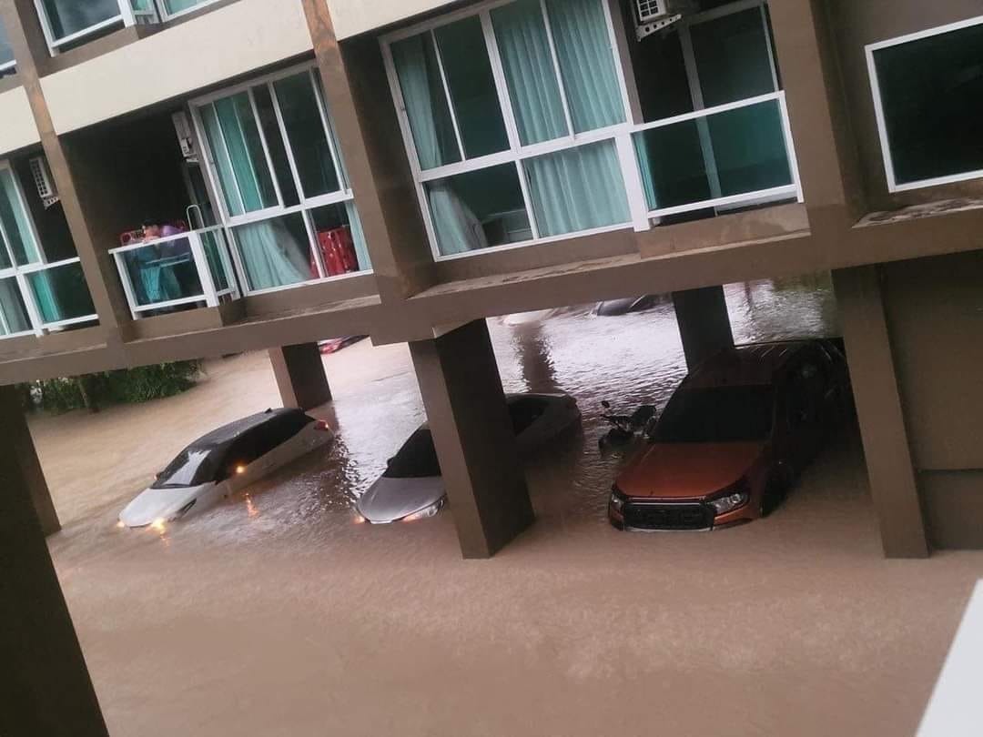 Heavy downpours caused flooding in many zones of Thalang district. A condominium building near Phuket airport was in deep floodwater and the motorcycles and cars of dwellers were inundated. Floodwater rose too fast for vehicle owners to move them. At least 40 cars and 20 motorcycles were under water there.
