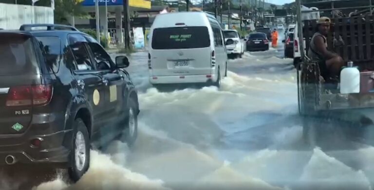 PHUKET, Sept 2 (TNA) – Many parts of Phuket province were flooded, especially Thalang district where vehicles were covered by floodwater after persistent rain. Meanwhile, the management of Phuket airport warned air travelers to arrive early.