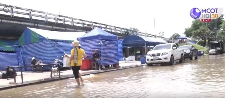The river also overflowed to another shelter under the Seree Prachathippatai Bridge and evacuees had to leave the refuge. (TNA)