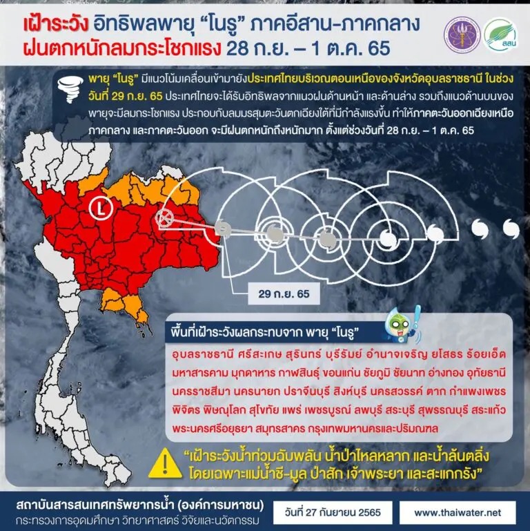 BANGKOK, Sept 27 (TNA) – Typhoon Noru will become a tropical storm when it arrives in Thailand on Sept 28-29, according to the Hydro-Informatics Institute.