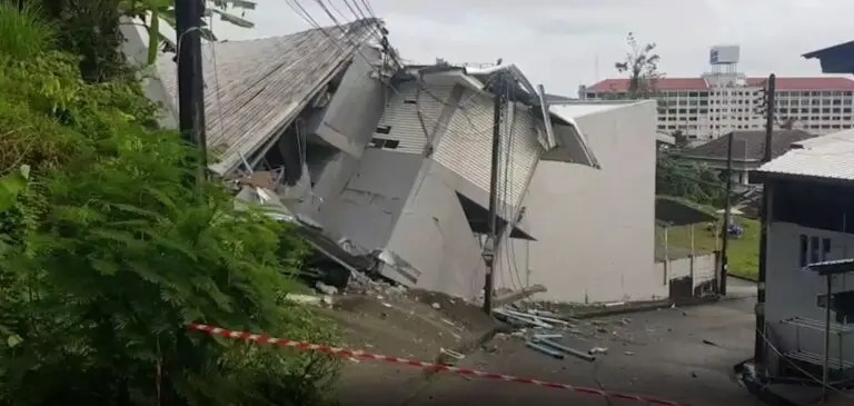 Thammarit Ritphakdee, an engineer from the Public Works and Town Planning Office of Phuket, said a landslide from a hill behind the building detached it from its foundation and officials concerned had yet to thoroughly examine the site.