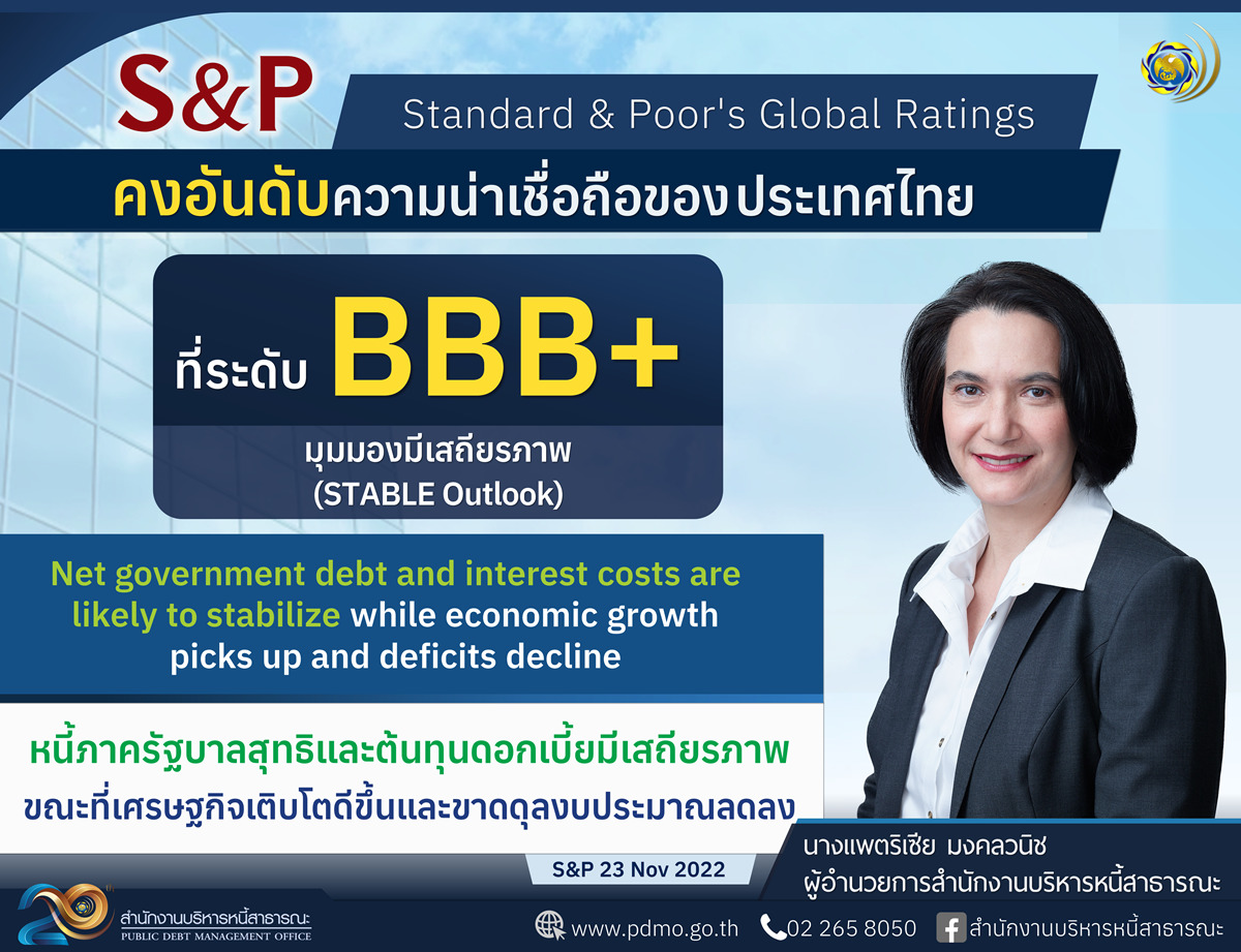 Patricia Mongkhonvanit, director-general of the Public Debt Management Office, said that on Nov 23 S&P Global Ratings (S&P) maintained the sovereign credit rating of Thailand at BBB+ and its economic outlook as stable.