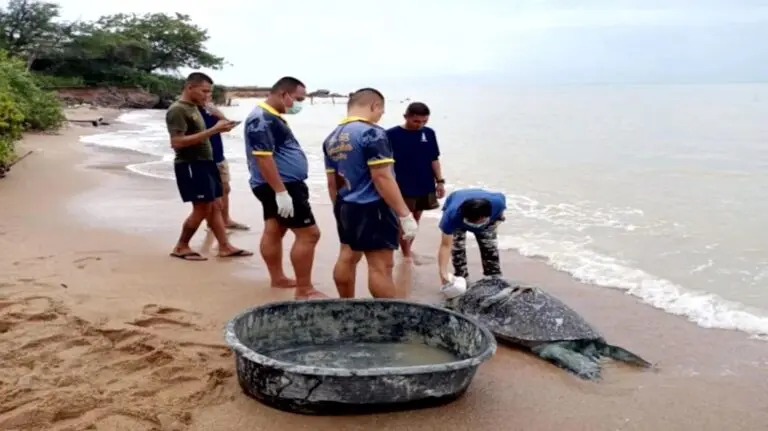 CHONBURI, Nov 28 (TNA) – A female green turtle carcass was found washed ashore in Chonburi and a necropsy later revealed fishing net, rubbish incluidng materials used to make Krathong in its digestive tract.