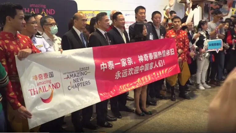 The first Chinese tour group of 40 people boarded a Spring Airlines flight from Guangzhou. They were welcomed by the Thai authorities at the aieport along with 90 individual Chinese tourists.