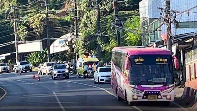 About 30 police officers rushed to the scene after reports on the shooting on the minibus near Kuan Dindaeng junction on Thepkrasattri Road. The driver stopped the bus to allow passengers to leave and the two injured passengers were sent to hospital.
