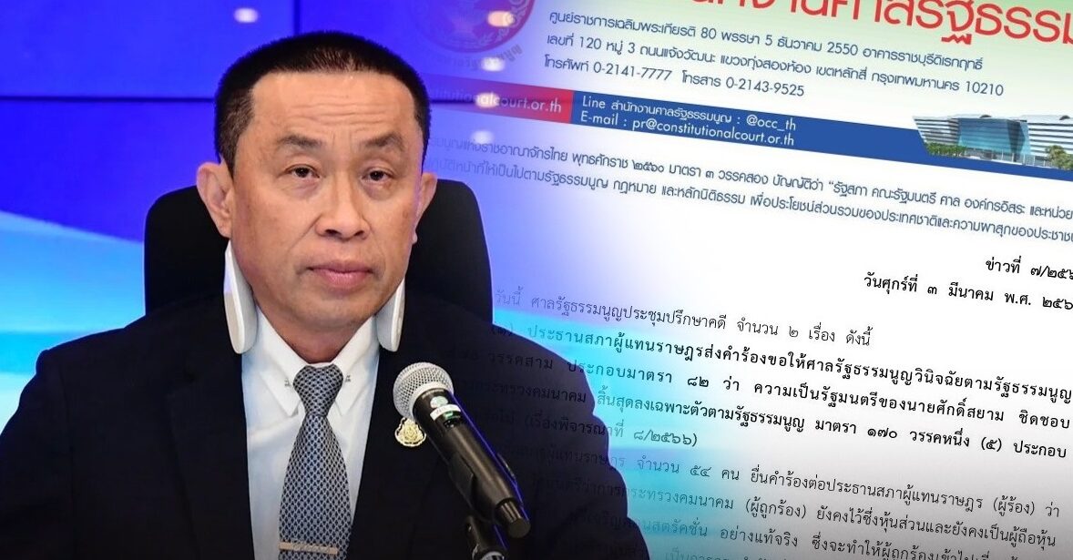 54 members of the opposition parties jointly submitted the petition to the Constitutonal Court, accusing Saksayam of concealing his assets and using a nominee to hide ownership of the company to win ministry construction projects.