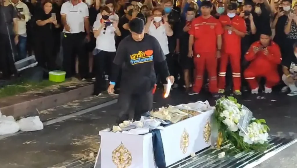 BANGKOK, July 20 (TNA) – Demonstrators conducted a mock cremation ceremony in a symbolic protest at the Democracy Monument late Wednesday.