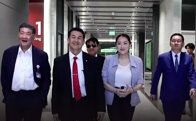 The Pheu Thai team, also comprising deputy leader Phumtham Wechayachai, secretary-general Prasert Chantararuangthong and party-list MP Suriya Juangroongruangkit walked from the Pheu Thai headquarters to the nearby Thai Summit Tower Wednesday afternoon.