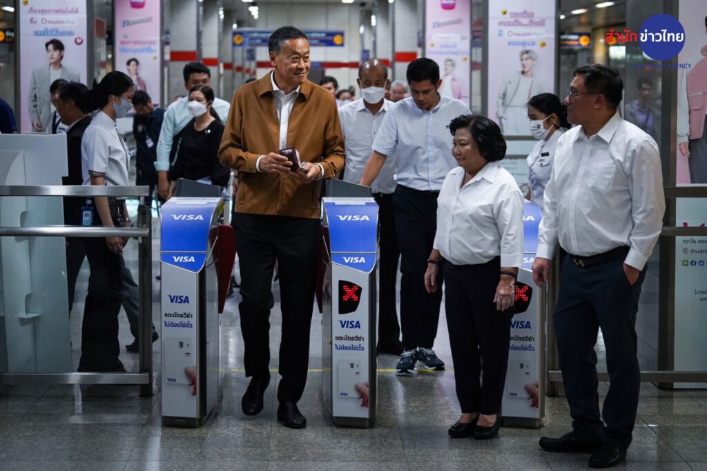 Accompanied by prospective deputy finance minister Julapun Amornvivat, Mr. Srettha walked from the Pheu Thai party headquarters to the underground MRT’s Phetchaburi station. From there, they took the subway to the Sutthisan station, heading to the Muangthai Phatthara Market.