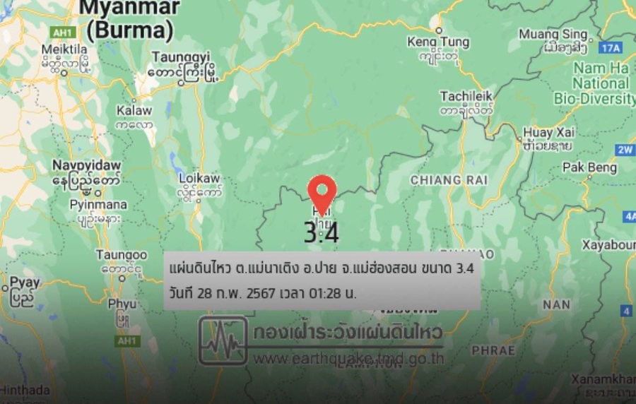 The earthquake monitoring division of the Meteorological Department reported a quake with a magnitude of 3.4 at a depth of 3 kilometers in Pai at 01:28 am.