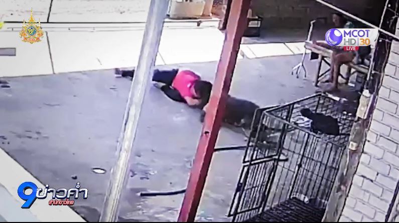 CCTV footage from a house in Chiang Mai’s Sansai district showed a male pit bull around 10 years old, leaping to maul the arm of a 30-year-old woman until she was pulled away by her boyfriend and the owner of the pit bull. It took over 2 minutes to separate them, leaving a pool of blood.