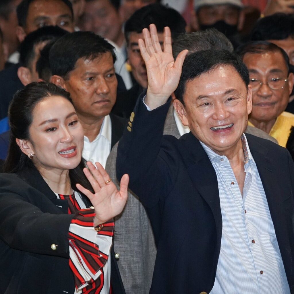 He then walked in to hug Paetongtarn Shinawatra, his daughter and the head of the Pheu Thai Party, who was standing in front of the party headquarters waiting to welcome him.